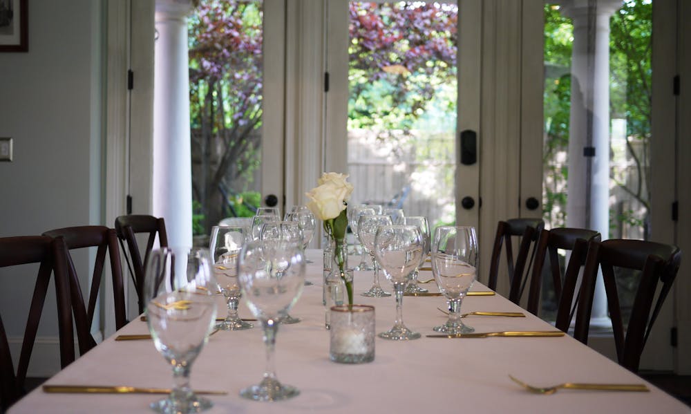 An event at the merchant house can accommodate up to 40 seated guests. Dinner is served in a three-course offering.
